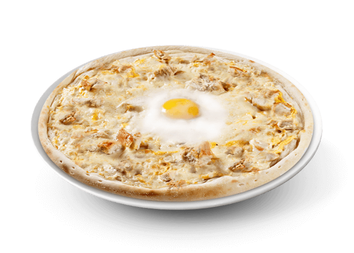 Crème fraîche, mozzarella, jambonnette, filet de poulet, pommes de terre, oignons frais, oeuf, persillade.